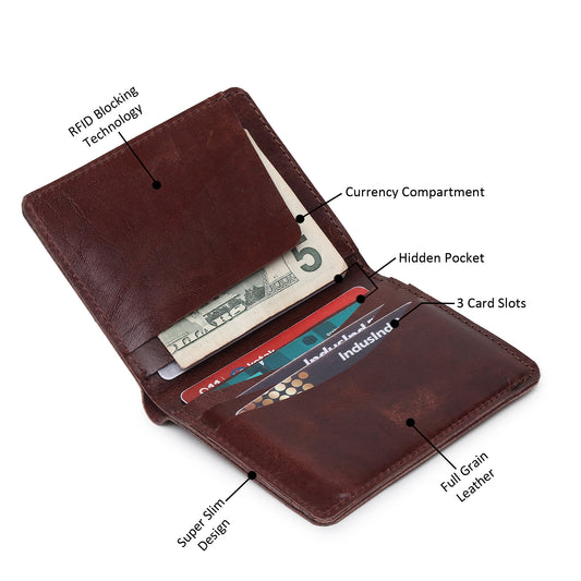Functional leather slim wallet. It has 1 credit card slot outside which is where I store the credit card I use most often. It has 3 card slots inside where I store my DL, Gas and AAA Cards. You also have storage on either side under the interior card slots that are well suited for some cash. I love the size of the wallet and like that I can only carry a handful of cards otherwise it would defeat the purpose of using it.